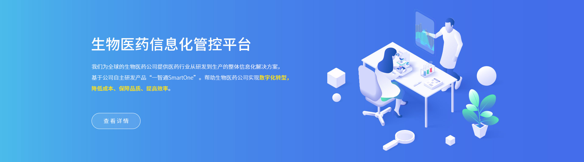 我們?yōu)槿虻纳镝t(yī)藥公司提供醫(yī)藥行業(yè)從研發(fā)到生產(chǎn)的整體信息化解決方案,基于公司自主研發(fā)產(chǎn)品“一智通SmartOne”。幫助生物醫(yī)藥公司實(shí)現(xiàn)數(shù)字化轉(zhuǎn)型,降低成本、保障品質(zhì)、提高效率。